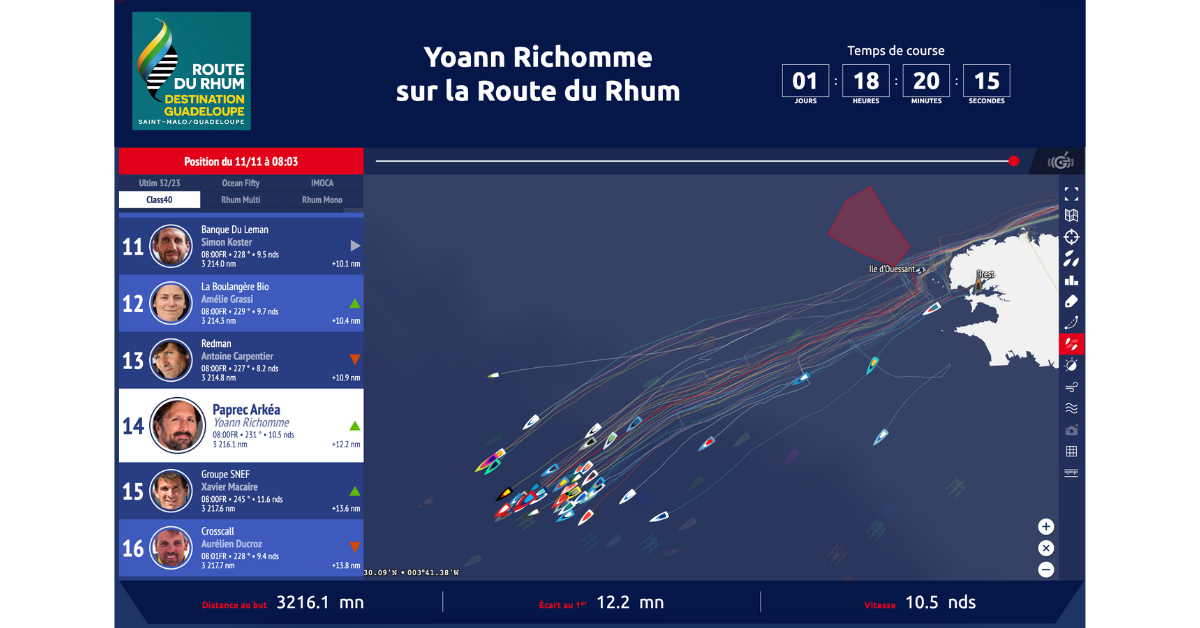 Jeudi en fin de matinée, lors des vacations, il assurait bénéficier de conditions « agitées, ventées » et « jusqu’à 27 nœuds de vent au passage de Ouessant ». Ensuite, place donc à ce long bord vers l’Ouest.