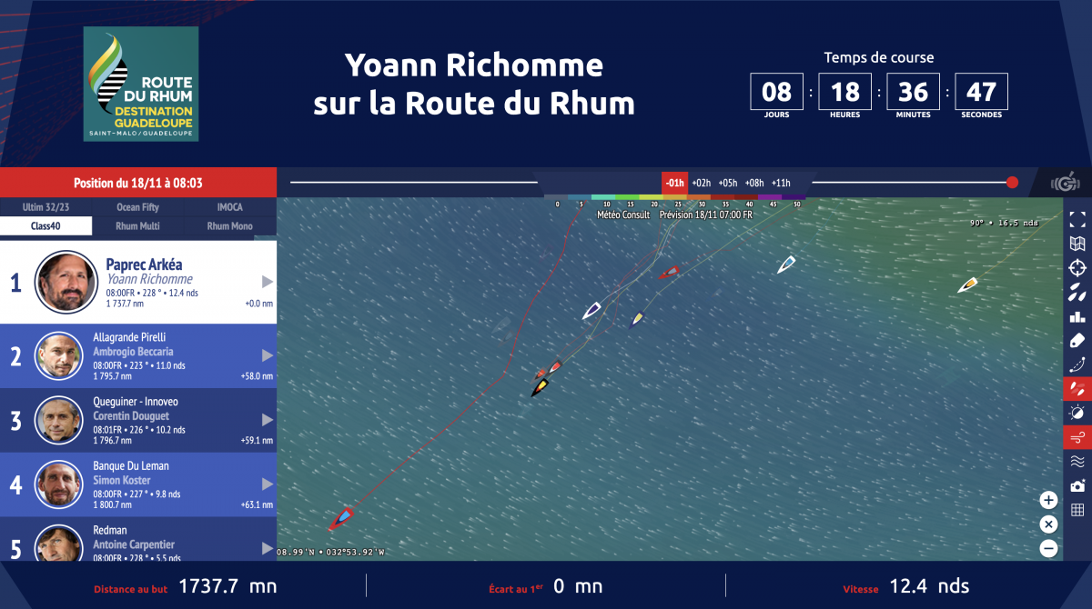 Le marin a passé une nouvelle journée en tête de course, lui qui occupe la première place depuis samedi soir. L’écart avec Corentin Douguet (Queguiner-Innoveo) s’établit désormais à 59,1 milles. Derrière, la hiérarchie a été bousculé. Xavier Macaire (Groupe SNEF), longtemps sur le podium, a constaté deux fissures à l’avant de son bateau (au niveau du bouchain et du fond de coque). S’il tente de réparer, il a dû réduire son allure. Désormais, ce sont Ambrogio Beccaria (Allagrande Pirelli) et Simon Koster (Banque du Léman) qui bataillent pour la troisième place. Yoann Richomme, lui, mène donc la danse à plus de 50 milles de là. Pourvu que ça dure !