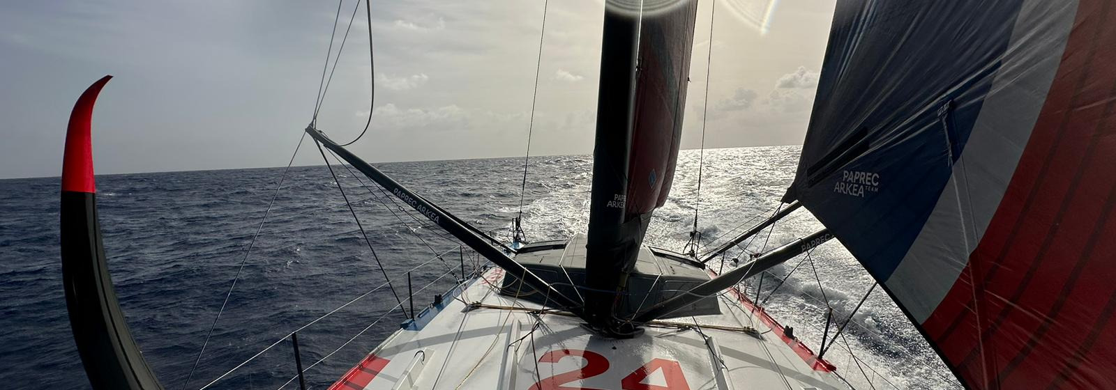 Ne jamais ralentir, toujours s’employer, jamais baisser la garde. Au cœur des alizés, la bataille redouble d’intensité et s’approche de la guerre des nerfs. En permanence, il faut trouver les bons réglages, déterminer là où le vent sera légèrement plus porteur. La situation de la course est inchangée depuis la veille. Paprec Arkéa pointe à 20 milles du leader, For People (Thomas Ruyant – Morgan Lagravière). Derrière, ils sont quatre, plus au Sud, à s’employer pour revenir sur Yoann et Yann.