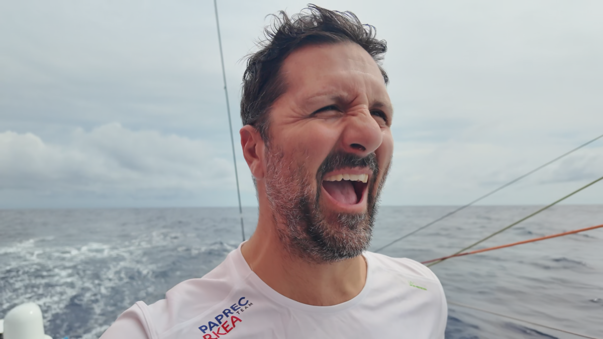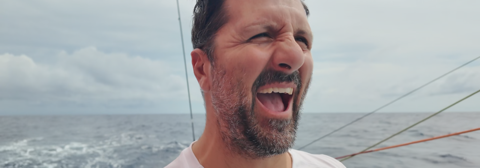 Pour résumer, les mots de Yoann : « Après une bonne nuit à bourriner, voici le Pot Au Noir ! C’est tout gris plein de nuages, des grains qui tordent le vent, des éclaircies, on va essayer d’avancer dans la bonne direction »