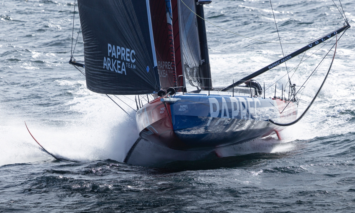 Lancé à pleine vitesse, Paprec Arkéa a dépassé la “Scoring Gate” du phare de Kiel en 2e position, empochant ainsi un point Bonus et entame cette première étape de la meilleure des façons !