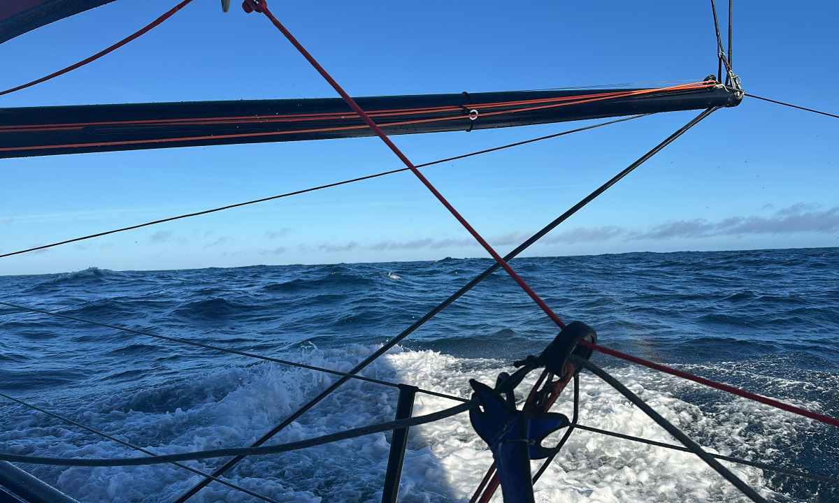 Yoann : « La nuit fut sautillante, la mer cassante par moments, mais globalement on a bien avancé ! Le vent commence à faiblir, on est sous grand voile haute et J2. On va vers moins de vent dans le golfe de Gascogne. »